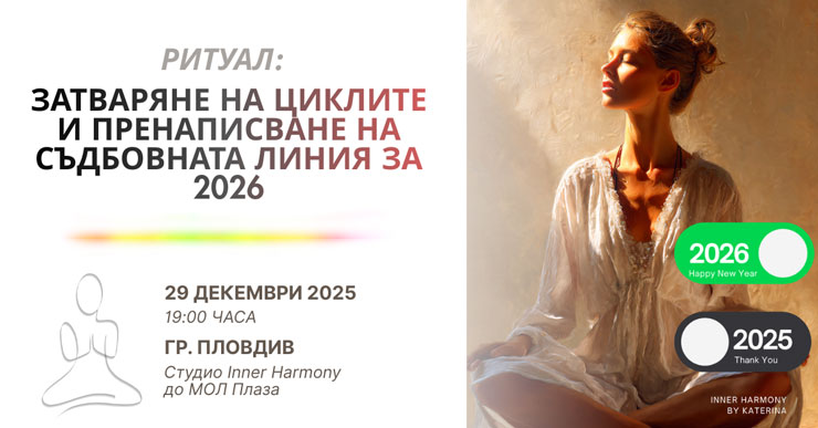 неделя, 19 октомври, 2025 г.Ново и много дълбоко преживяване. Донесе ми мир и хармония. Усещането, че аз съм творец на живота си и всяко мое утвърждение чертае пътя ми, ми отваря нов мироглед и възможност за вътрешна промяна.